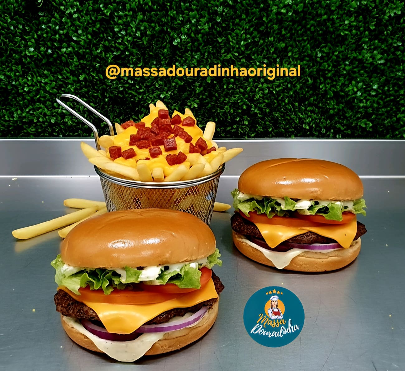 Acompanha em cada hambúrguer: Pão brioche, maionese verde, cebola roxa, carne grelhada, queijo cheddar, molhos especiais, alface fresca e tomate. Além disso, acompanha batata frita média com molho cheddar cremoso e calabresa na chapa, além do potinho de maionese verde.