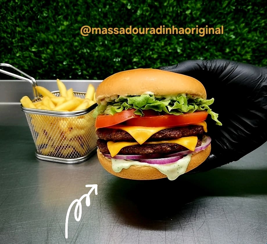 Acompanha: Pão de hambúrguer brioche, molho maionese verde, 2 carnes, molho cheddar, tomate, alface e cebola roxa. Acompanha batata frita pequena.