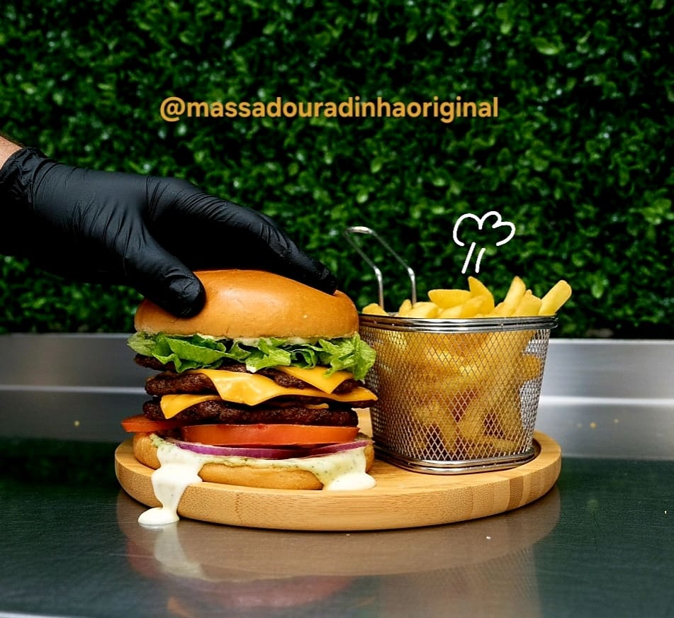 Acompanha: Pão de hambúrguer brioche, molho maionese verde, 3 carnes grelhada, molho cheddar, tomate, alface e cebola roxa. Acompanha batata frita pequena.