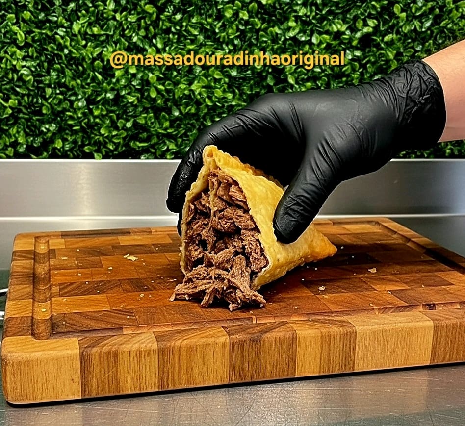 Massa colonial extra grossa, 120g de iscas de carne, calabresa em cubinhos na chapa, filé de frango e coraçãozinho.
