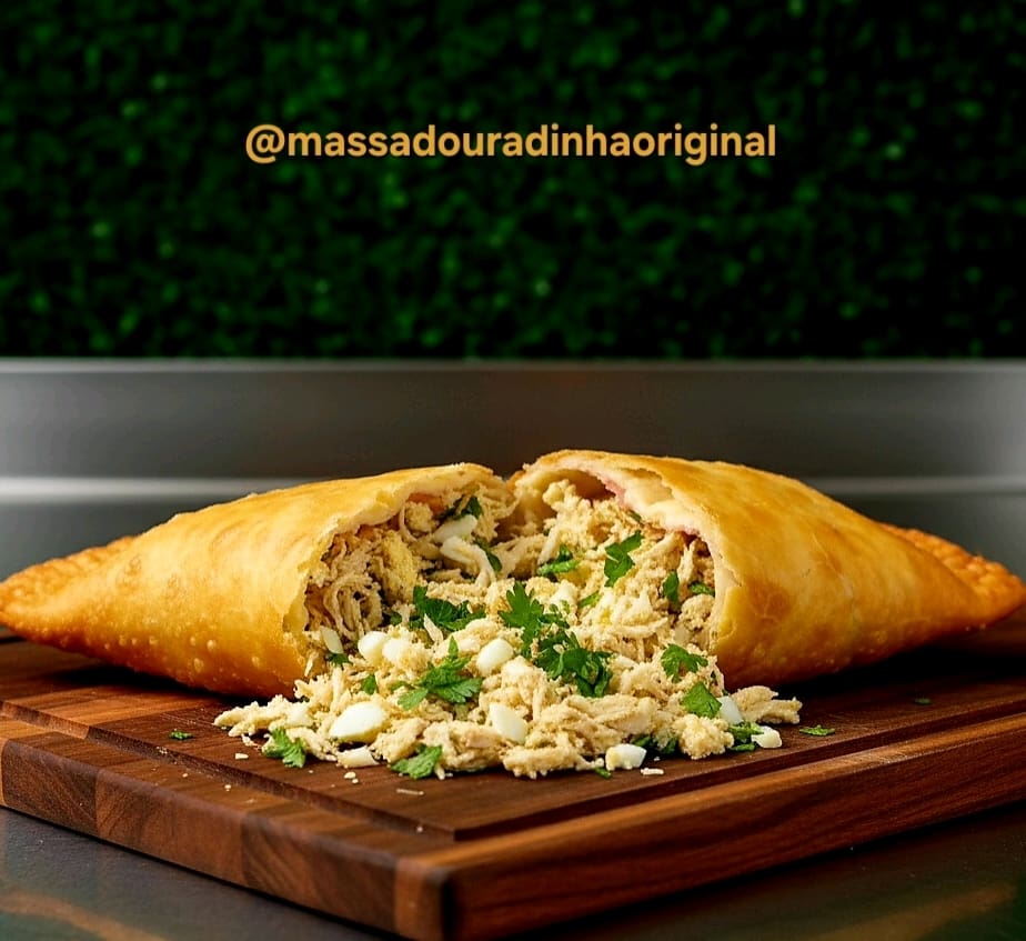 Massa colonial extra grossa com 100g de filé de frango desfiado, sem molhos na carne, bem temperadinha, temperinho verde, ovo cozido partido em duas metades e molhadinha.