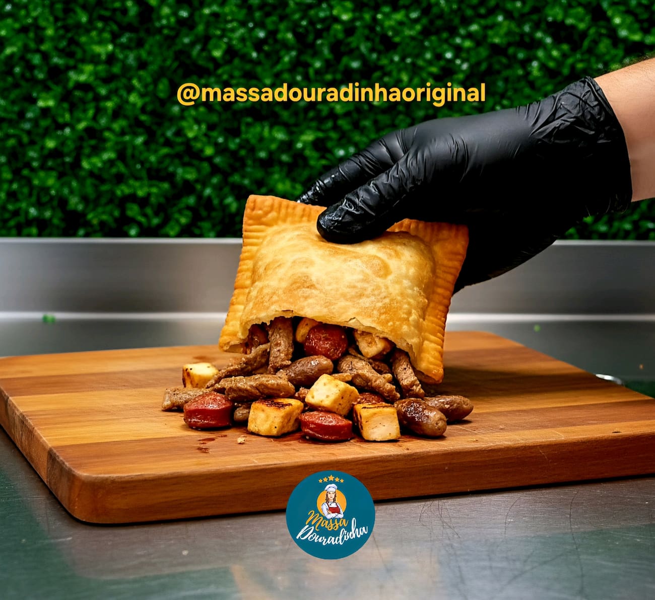 Massa colonial extra grossa, 120g de iscas de carne, calabresa em cubinhos na chapa, filé de frango e coraçãozinho.