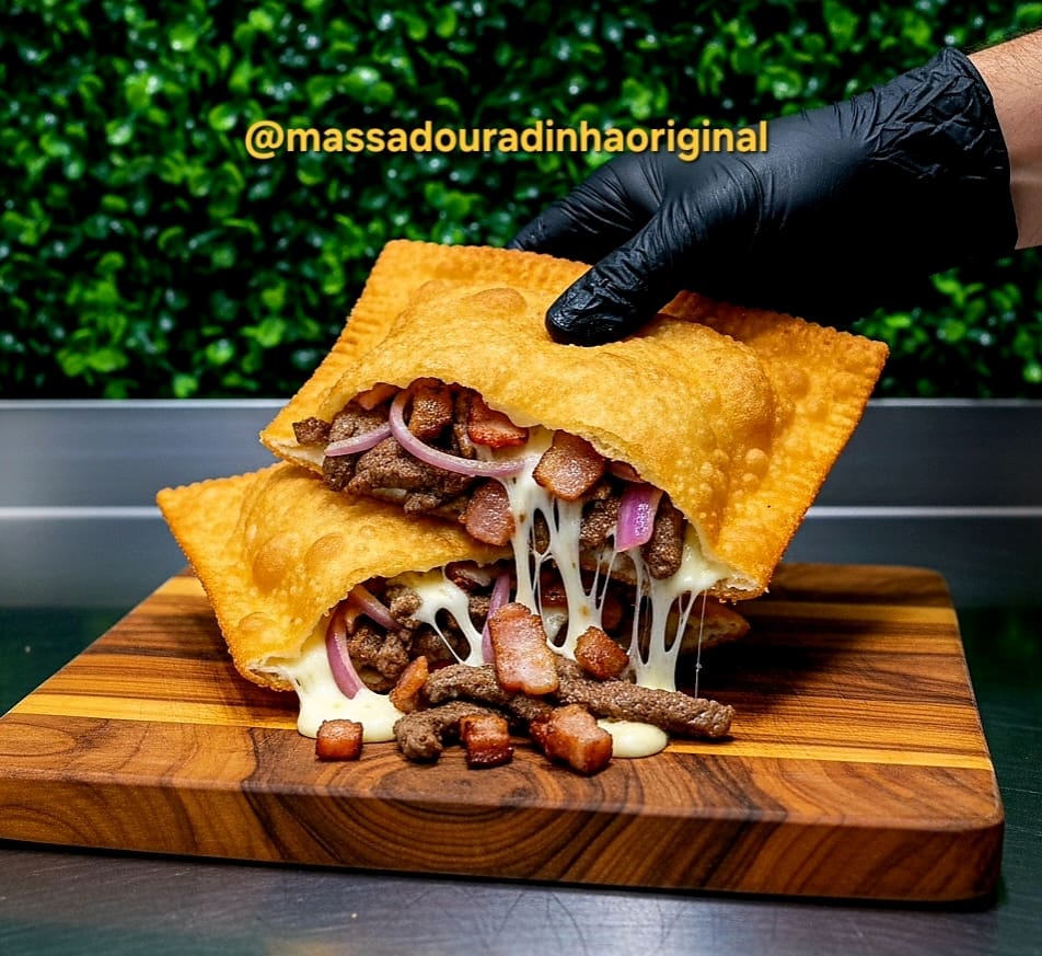 Pastel de Iscas de carne na chapa ao molho barbecue e temperinho verde