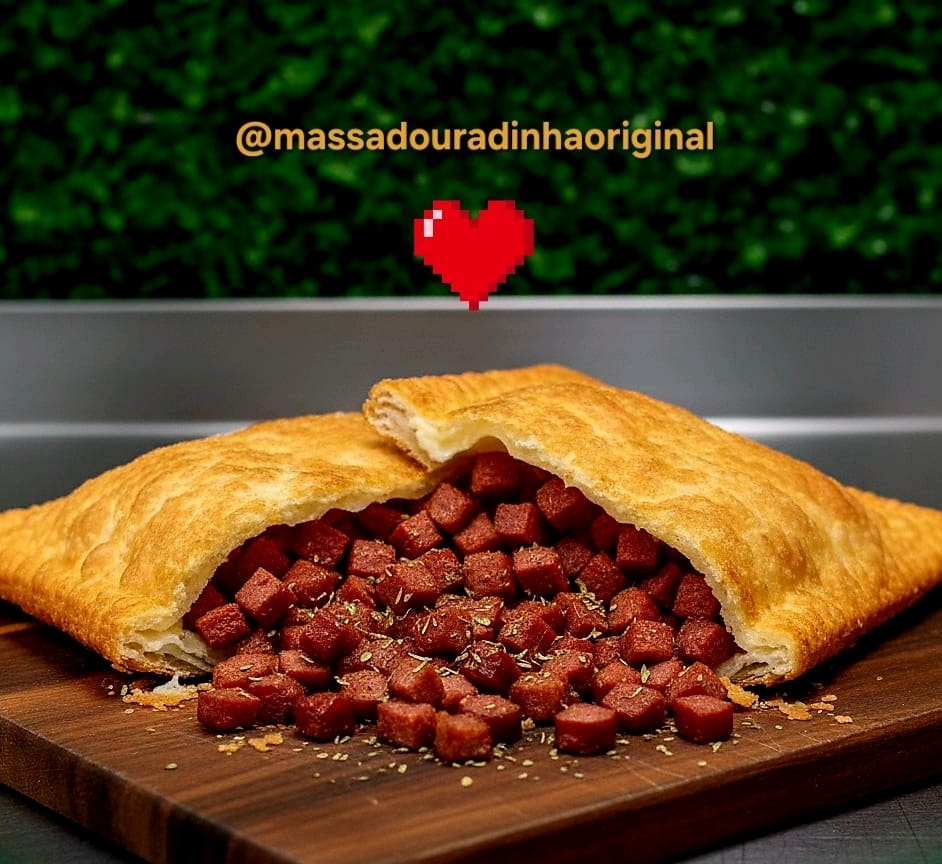 Pastel de calabresa na chapa, orégano e molho barbecue defumado