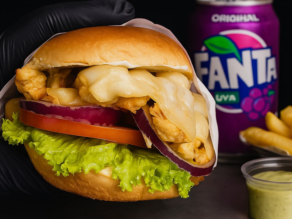 Acompanha: Pão de hambúrguer brioche, molho maionese verde, 100g de frango em cubinhos, molho cheddar, tomate, alface e cebola roxa. Acompanha batata frita pequena.
