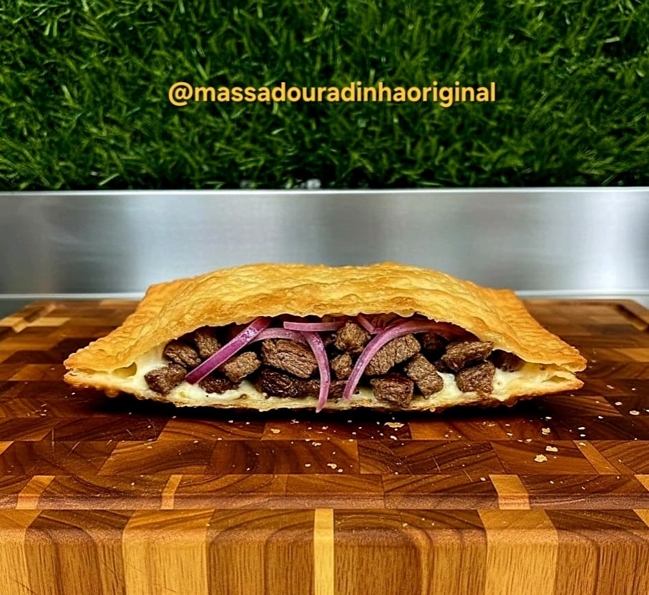 Pastel de Iscas de carne na chapa ao alho e óleo com queijo muçarela