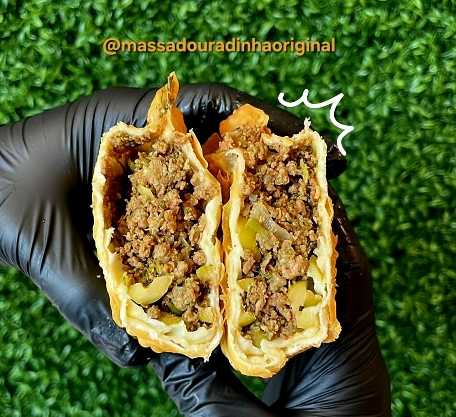 Massa colonial extra grossa com 100g de carne moída tradicional, com molho de alho, bem temperadinha, azeitona sem caroço e soltinha que nem arroz.