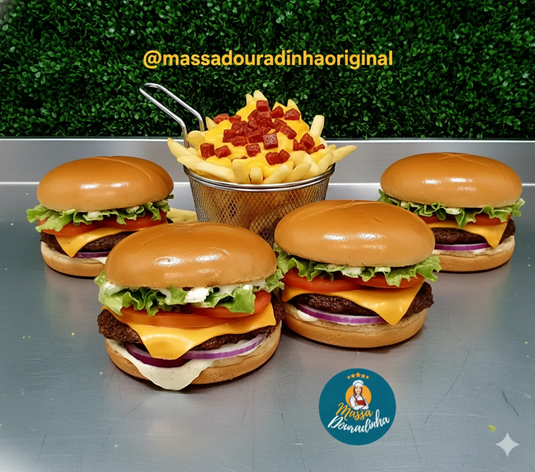 Acompanha batata frita, molho cheddar cremoso, 5 anéis de cebola, além de 1 potinho de maionese verde.